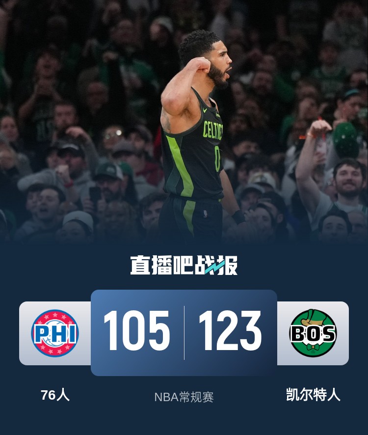 比赛上来,两队打得相对胶着,不过在首节后半段76人开始落入下风,凯尔特人逐渐将分差拉开到两位数,次节双方围绕着十分左右的分差展开拉锯,又是节末凯尔特人轰出一波攻势,半场结束时76人落后18分;下半场回来,76人虽然有追分势头,但从第三节末段开始,凯尔特人轰出一波20-2的攻势彻底打花比赛,最终凯尔特人大胜76人,迎来三连胜的同时也送给后者三连败。