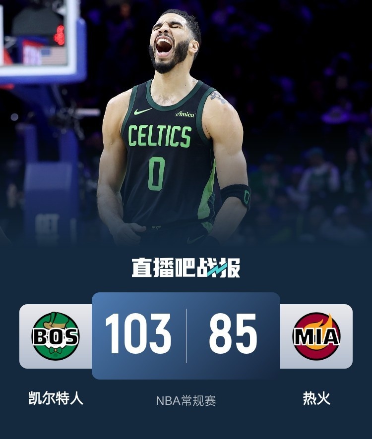 比赛开始,维金斯上来先造三分犯规带领热火打出不错开局,塔图姆不在状态,阿德巴约有攻有传带队拉开比分,但普理查德止血追到差6分,次节热火突然断电,豪泽接连4记三分助队轰出18-0超级攻击波一举建立双位数领先,塔图姆也接连攻筐取分,阿德巴约神奇压哨打板三分追到差9分。下半场,塔图姆全面找到手感,各种干拔三分加强硬突破单节轰下20分,热火苦苦回应,但凯尔特人外线下起三分雨直接拉开20分以上领先,末节热火接连外线打铁,凯尔特人始终保持20分以上领先,最终凯尔特人103-85轻取热火。