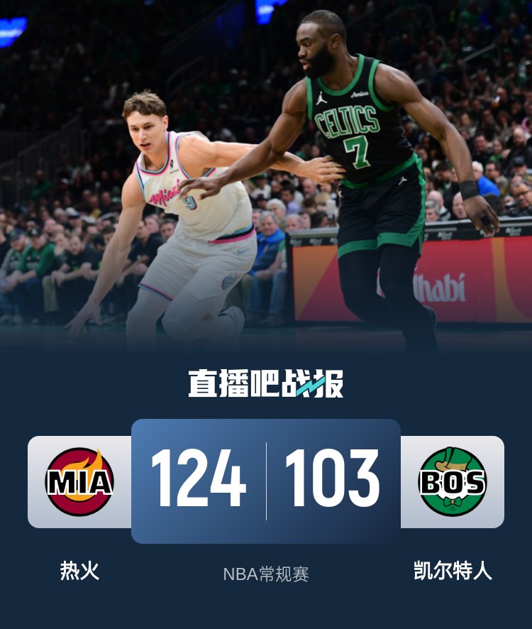 比赛开始,双方势均力敌,希罗和科内特对飙,比分咬得很紧,热火连中三分取得两位数优势,凯尔特人不断冲击篮筐连投带罚努力追赶,李凯尔高效发挥,热火连续追打普理查德拿分,半场战罢热火59-45领先凯尔特人。易边再战,热火持续发力将分差拉开到20分以上,凯尔特人回敬19-1的攻击波迅速迫近比分,末节双方围绕10分分差展开拉锯战,李凯尔稳定输出,热火连中三分,比赛还剩5分钟时凯尔特人换下主力投子认负。最终,热火124-103客场击败凯尔特人,豪取6连胜的同时终结绿军9连胜。