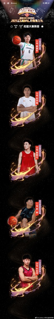 2025CUBAL全明星之夜扣篮大赛名单出炉,除了我们熟悉的老朋友,曾多次参加名校邀请赛且获得名次的上海交大姜宸轩之外,我们将目光投到联赛中的其他部分,最终锁定了剩下四名校园扣将,他们分别是来自泉城济南,曾荣获山东省扣篮大赛冠军,FIBA扣篮大赛亚军,来自山东体育学院的牛伯洋;来自彩虹天堂大美云南,拿下2024云南省联赛扣篮王称号,云南师范大学的梁敬仝;来自蜀地,多次受邀参与各项综艺、赛事的扣篮嘉宾,四川体育职业学院的苏烨;以及最后一位来自山东聊城,在去年连续拿下四省扣篮相关赛事的冠军,洛阳学院三届扣篮王的任甲瑞。