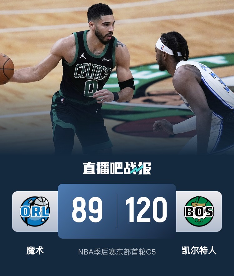 一开场,双方很快陷入缠斗,魔术连投带罚打出7-0的攻击波取得9分领先,凯尔特人轮番冲击篮筐拿分迅速追赶,次节魔术稳扎稳打保持微弱优势,凯尔特人外线哑火,只能不断杀伤内线咬住比分,两队各自完成一波小高潮,半场战罢魔术49-47领先凯尔特人。下半场,魔术命中率骤降,凯尔特人外线开炮连中三分,轰出22-4的进攻狂潮确立20分优势,末节凯尔特人再来3记三分继续扩大领先,魔术不断冲击内线苦苦追赶,凯尔特人越战越勇不断拉大分差。最终,凯尔特人120-89击败魔术,总比分4-1晋级次轮。