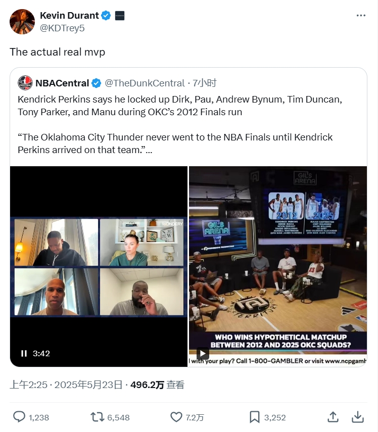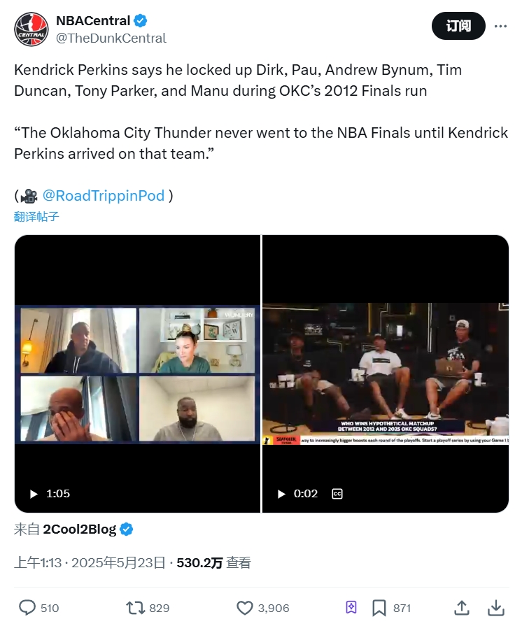 05月23日讯 前雷霆球员肯德里克-帕金斯今日参加节目时谈到了当年12年雷霆杀入总决赛的里程。