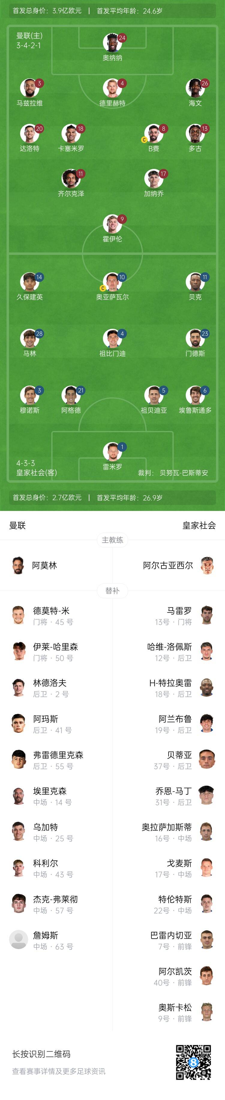 曼联首发:24-奥纳纳、3-马兹拉维、4-德利赫特、26-海文、20-达洛特、18-卡塞米罗、8-B费、13-多古、17-加纳乔、11-齐尔克泽、9-霍伊伦