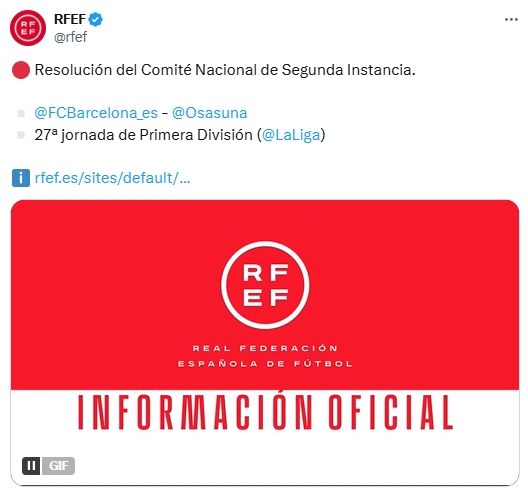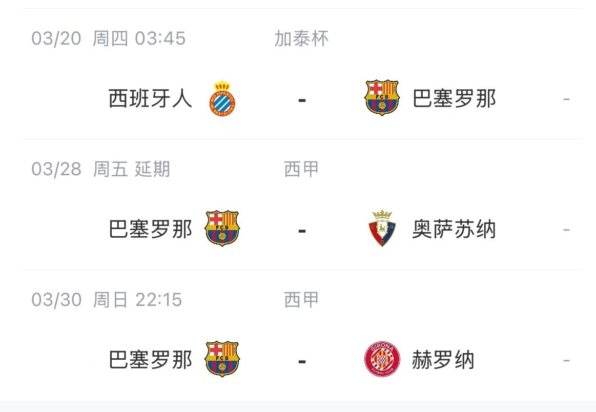 03月20日讯 西足协官方发布公告,巴萨与奥萨苏纳的上诉被驳回,比赛仍于3月27日举行。而奥萨苏纳vs毕尔巴鄂的比赛将被安排至30日进行。