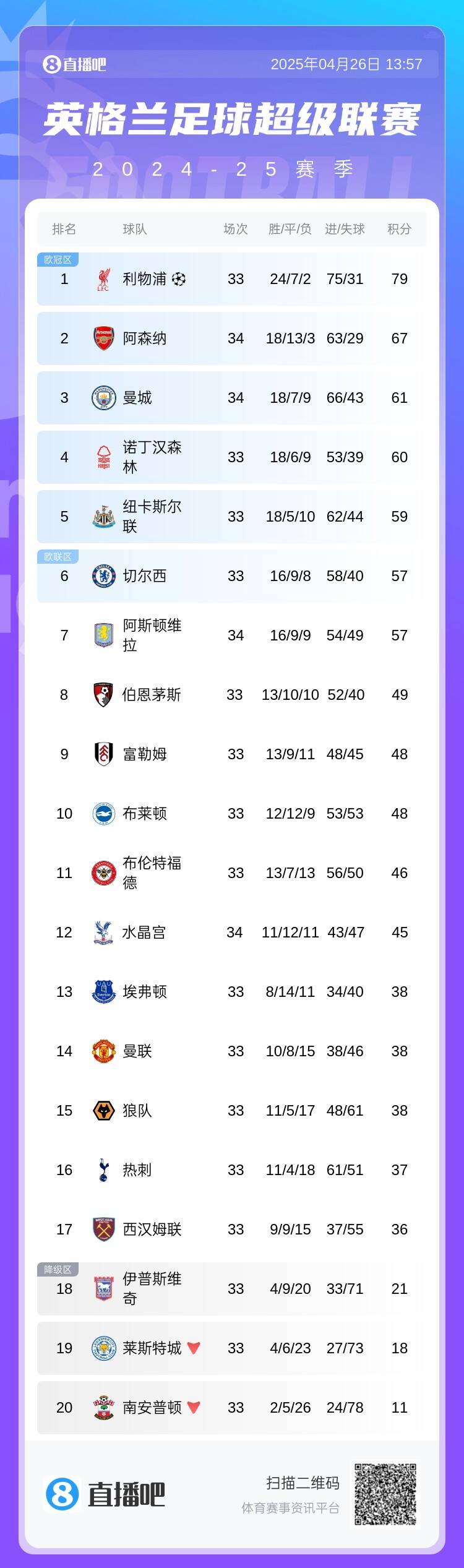 此时的英超积分榜: